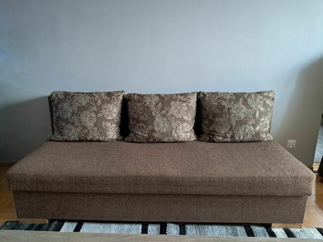 Wygodna sofa z funkcją spania w kolorze brązowym. . Posiada ozdobne poduszki z kwiatowym wzorem. Mebel jest w dobrym ...