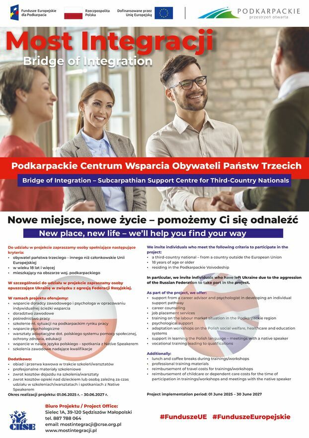 Projekt pn. „Most Integracji – Podkarpackie Centrum Wsparcia OPT” nr FEPK.07.17-IP.01-0005/24 współfinansowany ze środków Europejskiego Funduszu Społecznego Plus w ramach programu Fundusze Europejskie dla Podkarpacia 2021-2027, Priorytet 7: Kapitał Ludzki gotowy do zmian, Działanie 7.17 Integracja społeczno-gospodarcza obywateli państw trzecich, realizowany przez Centrum Rozwoju Społeczno-Ekonomicznego.
