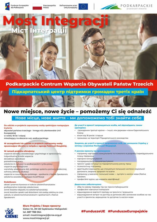 NOWY START w Polsce? Jesteś z Ukrainy lub innego kraju spoza UE? Mieszkasz w woj. podkarpackim? Ten projekt jest dla Ciebie!Centrum Rozwoju Społeczno-Ekonomicznego zaprasza do udziału w bezpłatnym projekcie „Most Integracji – Podkarpackie Centrum Wsparcia OPT” dofinansowywanym ze środków UE.