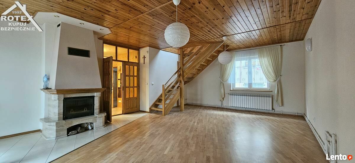 piętro - duży salon z kominkiem oraz z balkonem, kuchnia, pokój, łazienka;