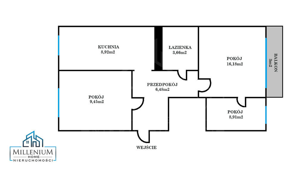 W ofercie Biura Nieruchomości Millenium Home na sprzedażfunkcjonalne, 3-pokojowe mieszkanie o powierzchni 54 m², położone