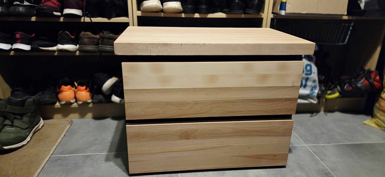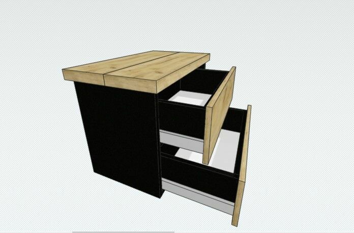 Połączenie płyty meblowej z blatem drewnianym oraz drewnianymi frontami szuflad. Drewno olejowane lub lakierowane.Drewno: sosna, buk, dąb lub jesion