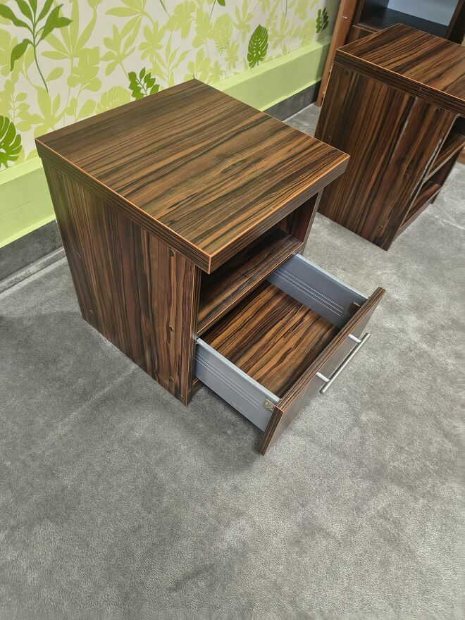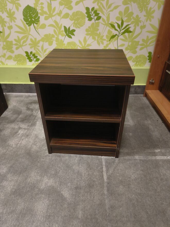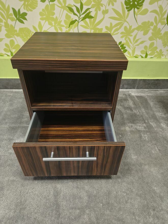 Praktyczna, drewniana szafka nocna w ciemnym kolorze. Posiada dwie otwarte półki, lub druga wersja z szufladą,które pozwolą na wygodne przechowywanie różnych przedmiotów. Mebel jest w dobrym stanie, nadaje się do użytku w sypialni lub innym pomieszczeniu.Odbiór osobisty Parkowa 10 (budynek dawnego przedszkola) w dni powszednie 9:00 - 16:00